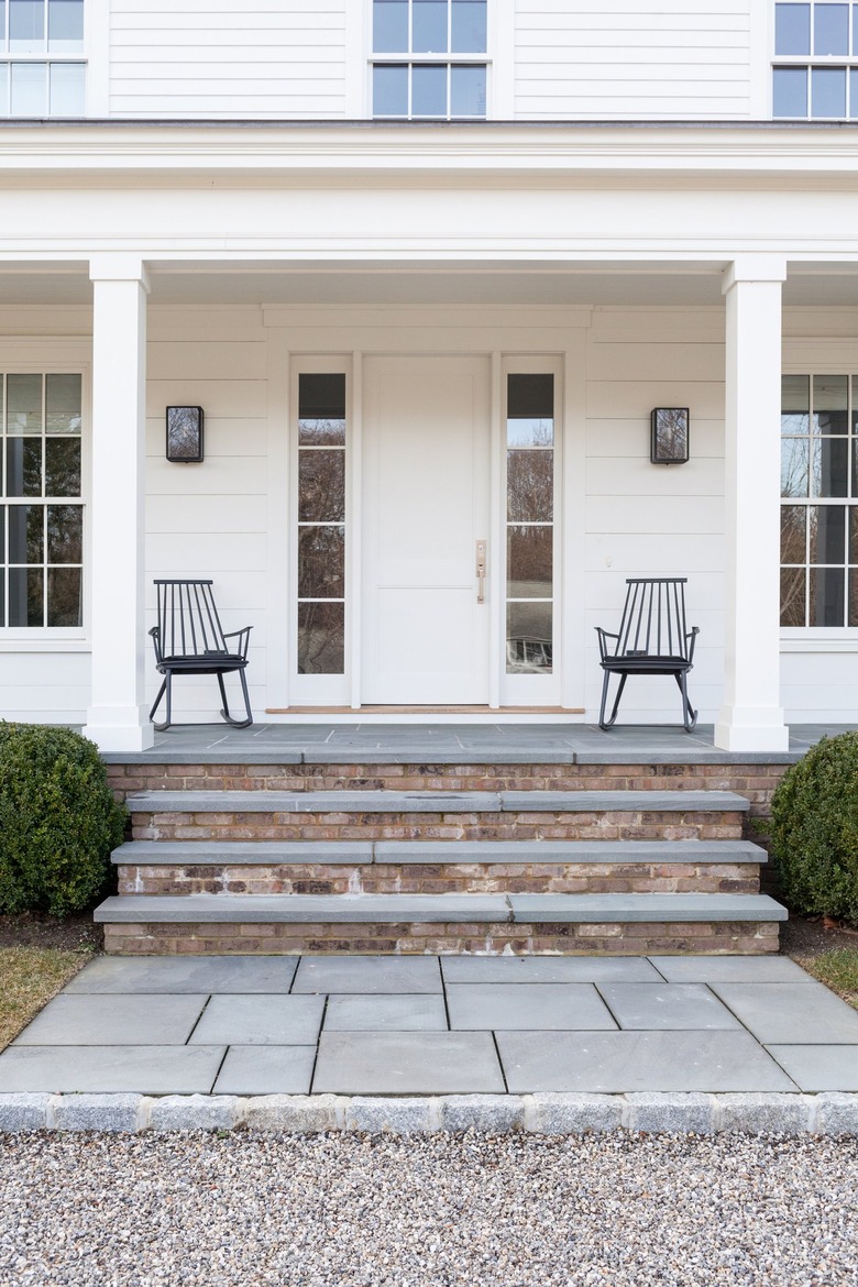 A pair of rocking chairs on the front porch is a quintessential part of a farmhouse home, and it makes the perfect spot for sipping lemonade on summer evenings. Add chairs in pairs for a friendly, inviting atmosphere. For an updated look, go for more contemporary rocking chairs, like the black stick-back ones Chango & Co. chose for this farmhouse porch.