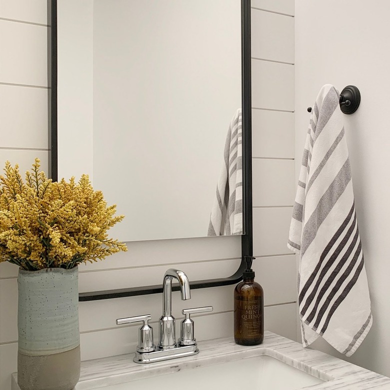Just one plant can make a space feel friendlier and more alive, whether it's a bouquet of wildflowers and greenery, a pot of herbs, or a dried floral arrangement. The yellow blooms beside the sink in this farmhouse bathroom styled by Kristina Steinmetz bring a burst of color to an otherwise neutral palette. Choose a ceramic vase for a timeless look.