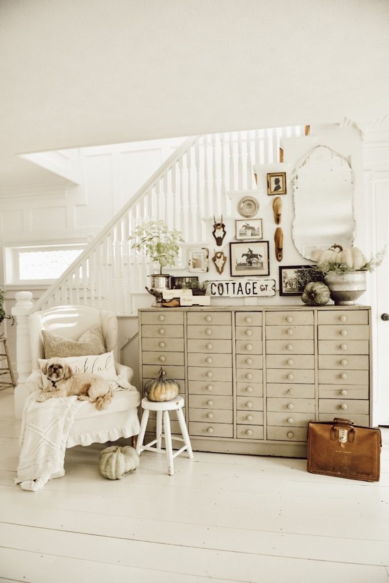 Think of your flea market finds as a collection of treasures that deserve to be part of your overall design, not stashed away in the basement, waiting for the perfect occasion. Choose items within the same color family and create a gallery wall, an approach Liz Marie turned to when setting up her antique farmhouse entryway.