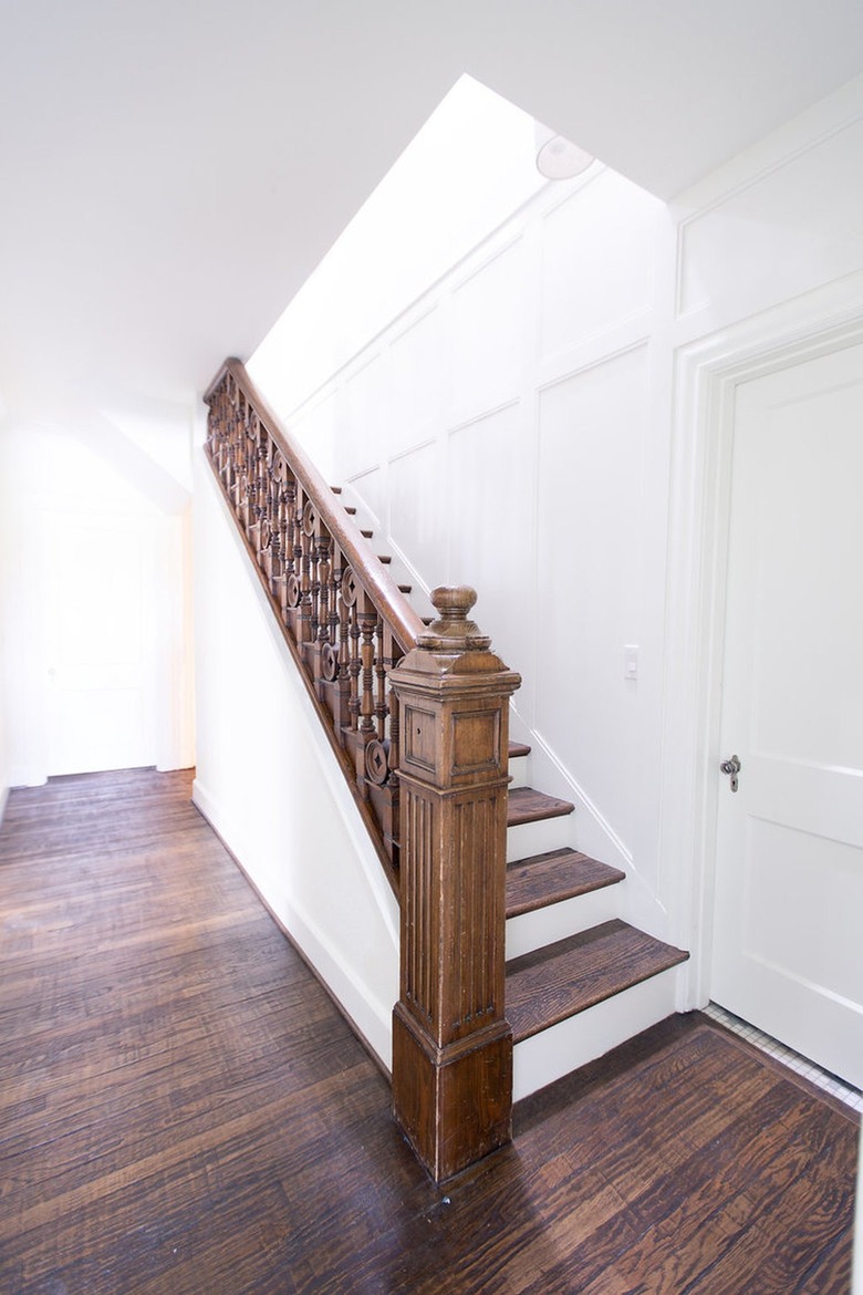 Sleek design, open floor plans, and all-white walls may be popular, but don't forget to stop and take notice of the beauty already present in your space. Especially if you've purchased an old house, keep an eye out for details you can save and incorporate into your farmhouse decor — like this dark wood staircase in a home designed by Christine Zeiler Interiors. To complete the look, add vintage-style fixtures like switch plates and doorknobs.
