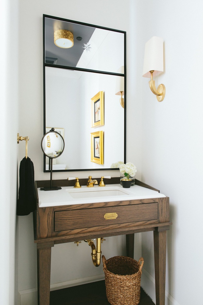 Changing the little things can make a big difference. Consider updating your doorknobs, cabinet hardware, drawer pulls — even your faucets. This powder room designed by Grand Traditions shows careful attention to detail with its matching gold-colored fixtures. They contrast with the rustic wood vanity for a perfect vintage farmhouse feel.