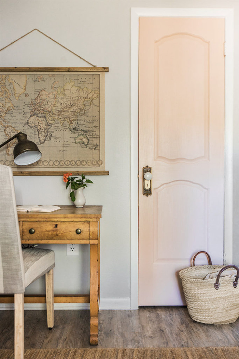 Another way to bring vintage flair to your farmhouse decor ideas is by including colors from a past era. For example, pink used to be commonly seen in homes, and it has made a comeback once again. Add a dash of that old-school color into your space by painting the door and pairing it with a vintage doorknob and other antique accents, something that Jenna Sue achieved in this primary bedroom.