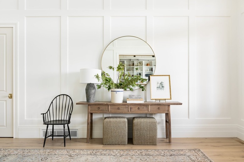 This entryway might be in a ranch home in Utah, but it would fit just as well in a big city. Wall paneling elevates this space styled by Studio McGee, making simple decor items look luxurious. A large gold-framed mirror adds extra interest and reflects more light around the room.