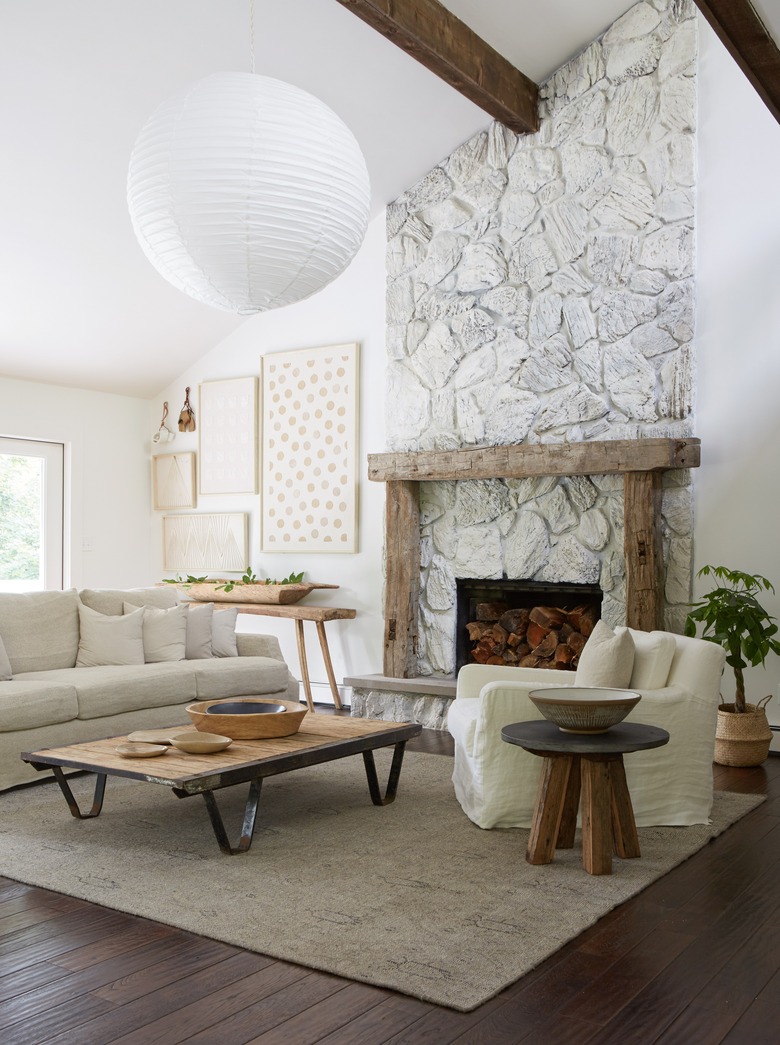 Just because a room is outfitted in farmhouse decor, that doesn't mean it has to be completely dedicated to all things farmhouse. In fact, you can set a totally unique tone for a space by mixing vintage details with contemporary pieces. Leanne Ford nailed the farmhouse-meets-modern approach in this living room by outfitting the rustic space with non-traditional accents like sculptural tables and a giant paper lantern.