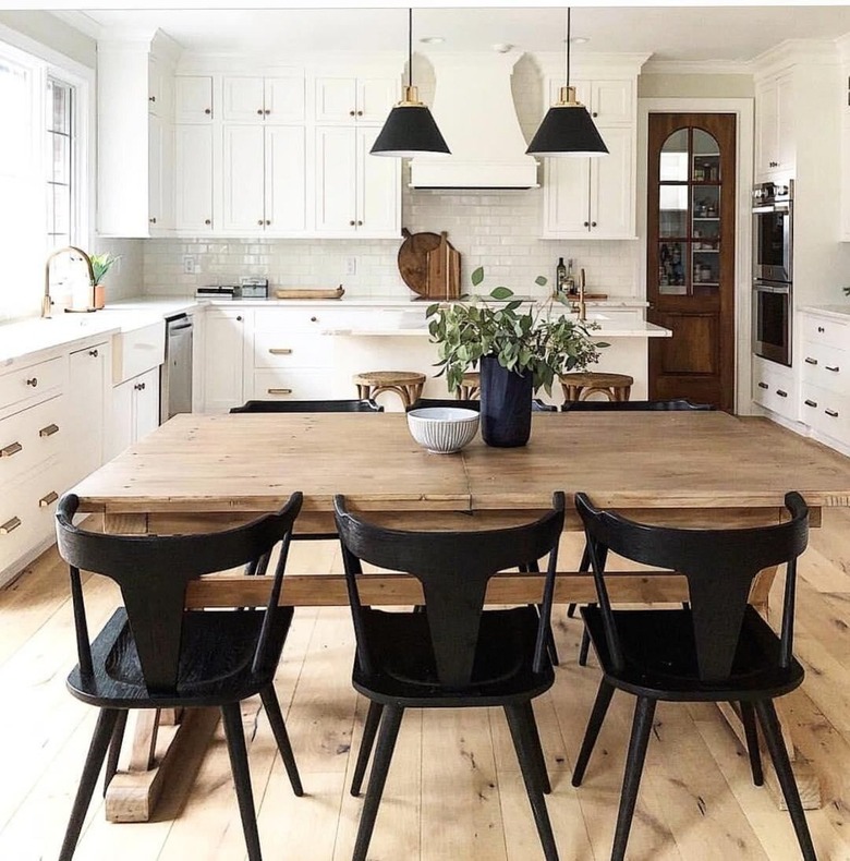 The dining table is an important part of any home — and that's especially true with farmhouse style, which emphasizes gathering with those you love. A large, rustic wooden table (like this one in a dining room styled by House Seven Design) will go a long way toward setting the tone of your space. Paired with stylish black chairs and pendant lights, it takes on a modern farmhouse look.