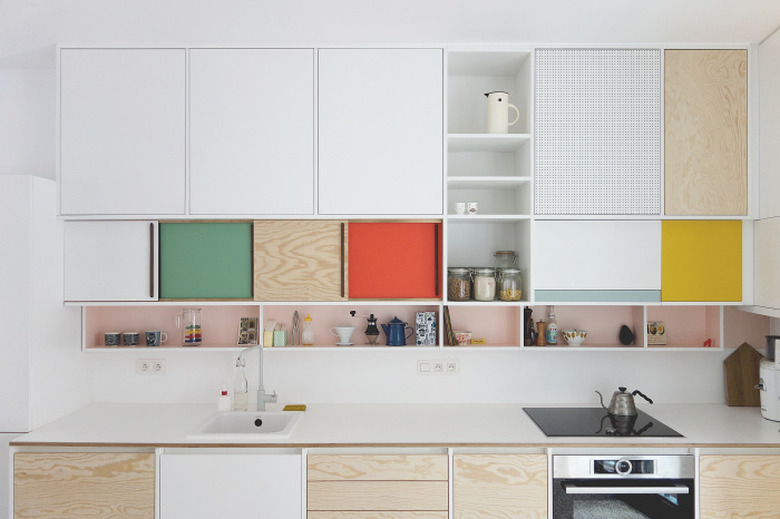 Color-blocked kitchen cabinets add midcentury appeal to the cook space and lend a feeling of unexpected playfulness, too. Opt for all-white splashed with a few yellow- and pink-colored cupboards, as seen in this kitchen by Belgium-based designer Dries Otten, or go for bigger swaths of color instead.
