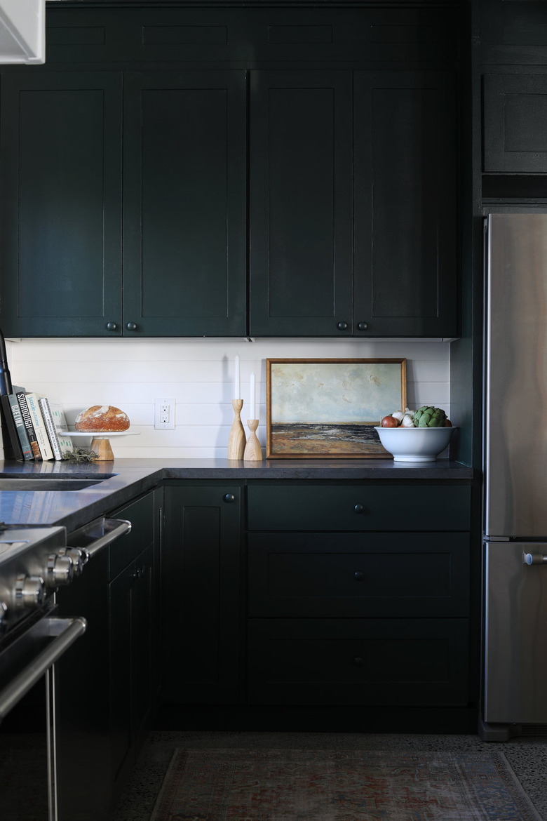 One of our all-time fave kitchen cabinet ideas: Go all-over dark. But select a hue that's not quite black, like Garrett and Cathy from The Grit and Polish. They went with Sherwin-Williams Jasper for a deeply dramatic and moody effect.