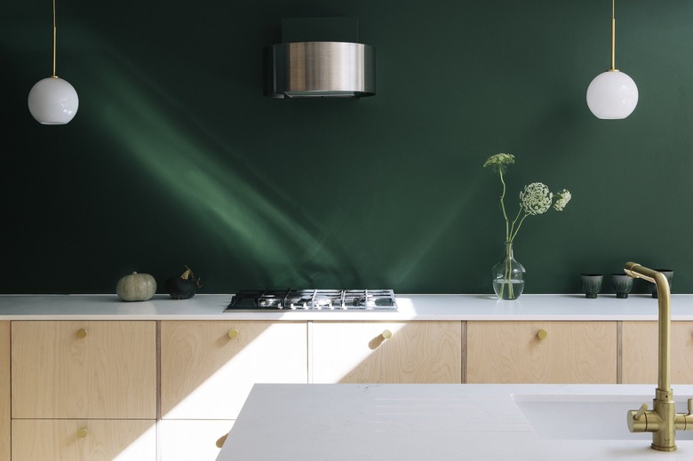 Last but not least, we always love the fresh look of plywood kitchen cabinets. And bonus: They're often hardy and cost-effective, too. Pair with a rich shade of green and elegant pendant lights to complete the look.