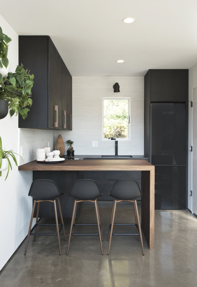 Gone are the days of cottage-y white kitchens: For a modern look, go for black instead. Pitch-black cabinets, paired with a bit of white — as seen here in Julie Van Daele's kitchen — look classic and oh-so-chic.