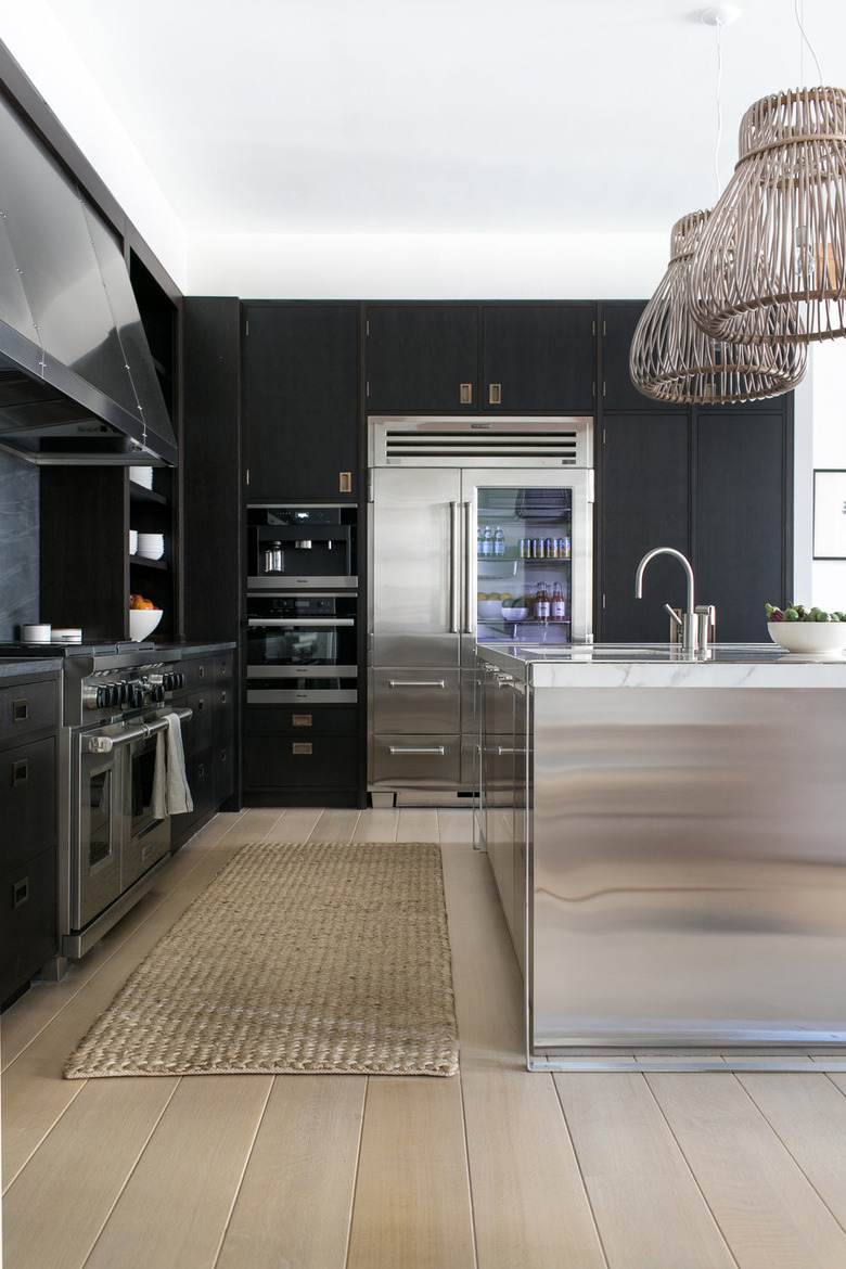 For a super cool, almost industrial look, consider stainless steel kitchen cabinets. Though stainless is shiny and sleek, it's also highly practical, used often in commercial kitchens because it's easy to clean. Optional: Pair with dark cabinetry and walls, as seen in this New York City cook space designed by Chango & Co.