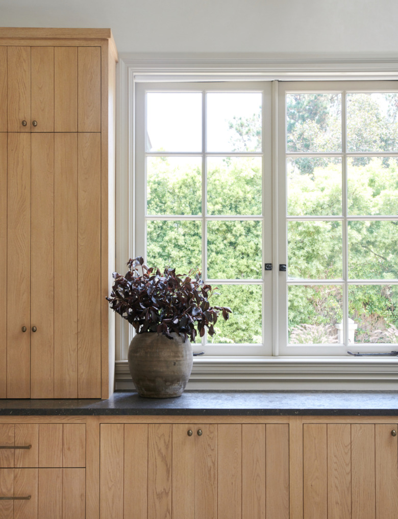 If it's wood you like, keep cabinets looking modern with clean lines and minimal-to-no ornamentation. The cupboards in this kitchen designed by Amber Lewis have simple paneled slab doors in a light wood finish, but are otherwise streamlined and unadorned.