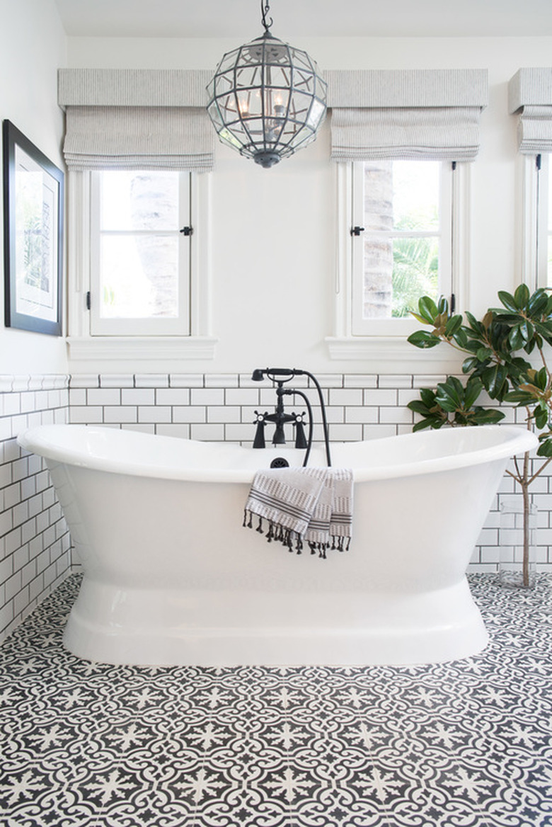 A classic, timeless choice? A simple white subway tile backsplash. For high contrast, pair with a darker-hued grout, as seen in this bathroom by Byrd Design. While light grout with white tile looks clean and bright, choosing dark grout helps to avoid the discoloration that happens to white- and light-colored options. Just be sure to keep it clean and dry.