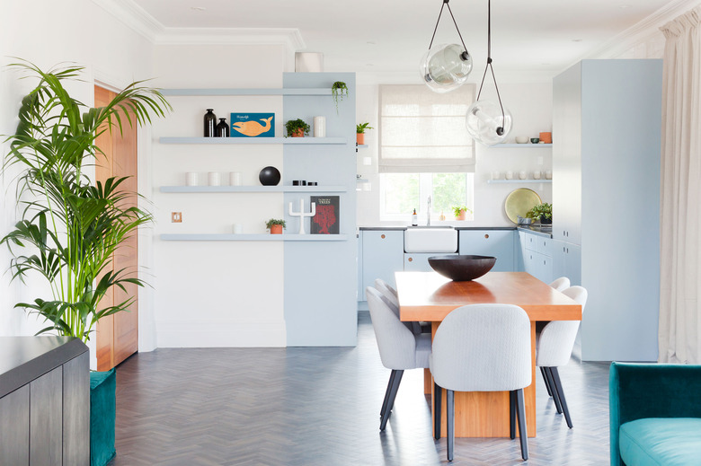 Don't assume that blue can only be used in traditional settings (as it often is) and opt for a more contemporary application. This bespoke kitchen designed by 2LG Studio is made in the UK from solid wood with cherry wood cut out cabinet pulls. The design duo matched the pastel color of the cabinets to the walls and open shelving, creating a modern kitchen that nods to sixties design.