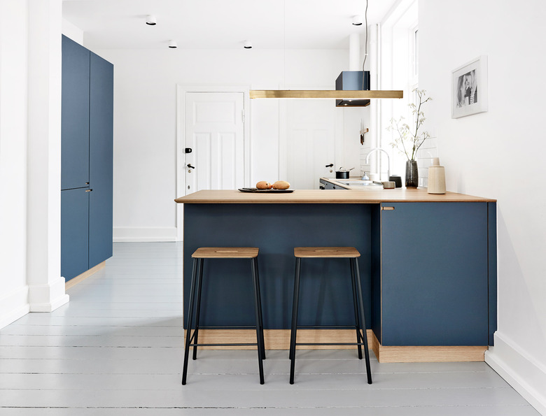 If you're going for all-white kitchen cabinetry, a feature wall can create a really striking contrast to break up the room. We love the tonal shade of blue used in this minimal kitchen by Enkontrast — the perfect complement to the gray pendant light and stainless steel fixtures.