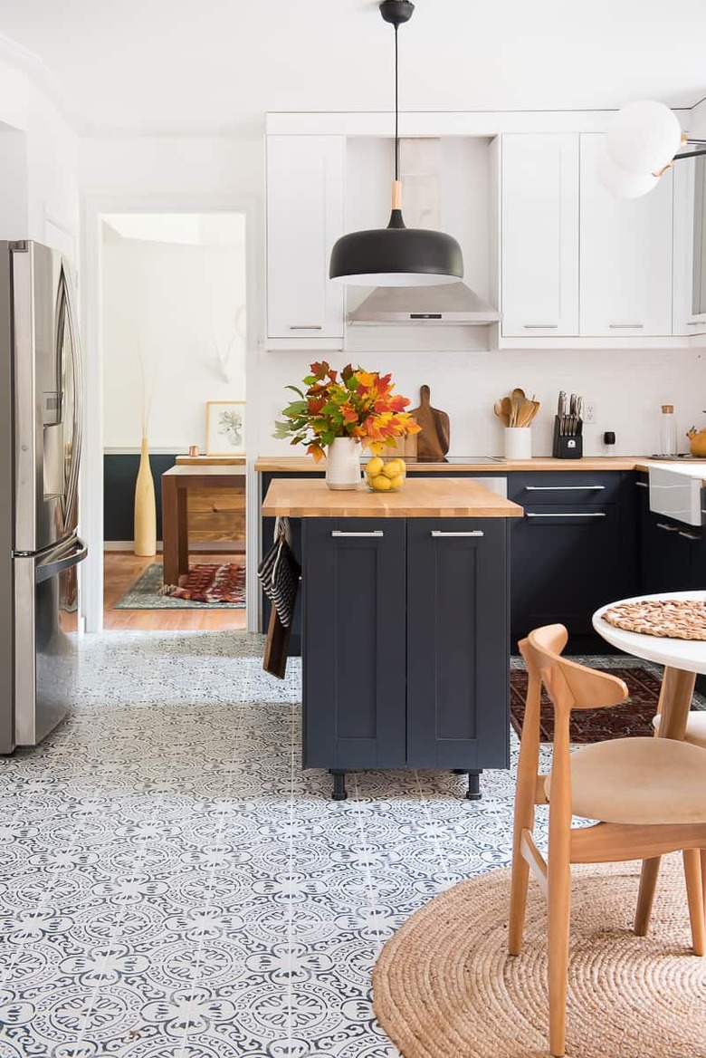 The graphic floor tile in this design by Hunker favorite Emily Henderson sets the tone for the rest of the blue and white kitchen. That pattern is just glorious! The blue cabinetry paired with brass fixtures is both modern and timeless, and we're pretty sure the whole thing is just going to get more and more beautiful over time.