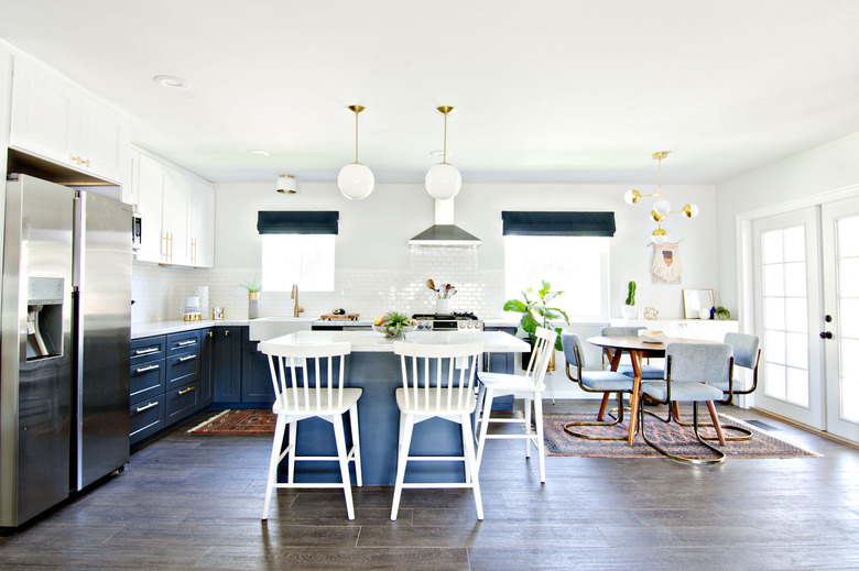 Take the two-tone kitchen trend even further by adding another shade to the mix with the help of furniture and decor. Brittany Makes has created the ultimate midcentury modern blue and white kitchen, mixing tones of navy, white, gold, and light blue for an ultra-glam finish.