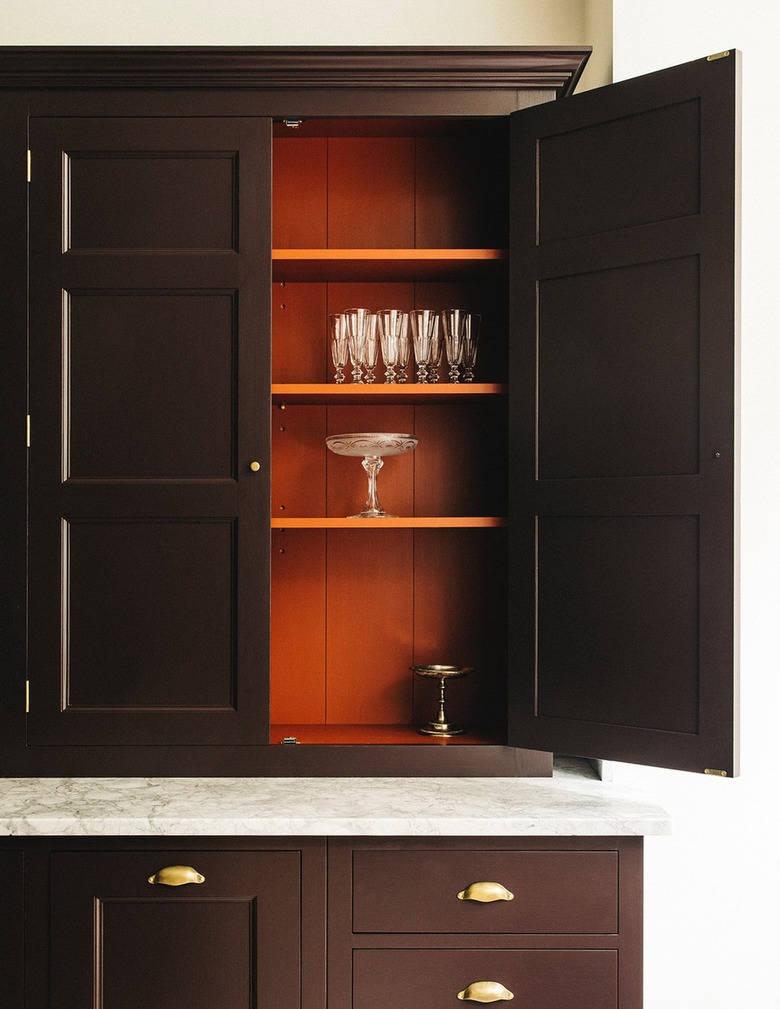 As this cook space from Mary Patton Design proves, orange + copper = a match made in kitchen heaven. The combo is evocative and unexpectedly sophisticated. Plus, as a cool optical illusion, it almost feels like the copper backsplash is reflecting the orange.