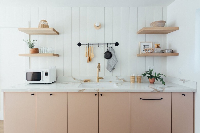 Black hardware can add just enough contrast to a pink culinary space without overwhelming its cool color scheme. And to add even more visual interest, follow the lead of Studio Surface and add a bit of texture in the form of wood shelving and shiplap wall paneling.