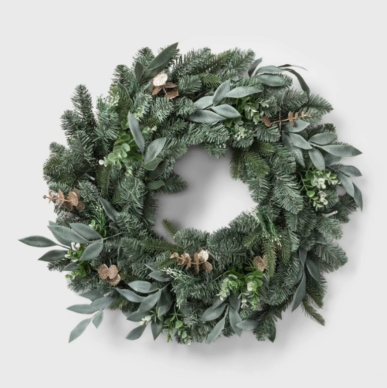 The real bonus of faux wreaths? No pine needles from vigorous shaking. This version adds sprigs of eucalyptus for a modern twist, and kids will love the battery-operated twinkling lights hidden inside.