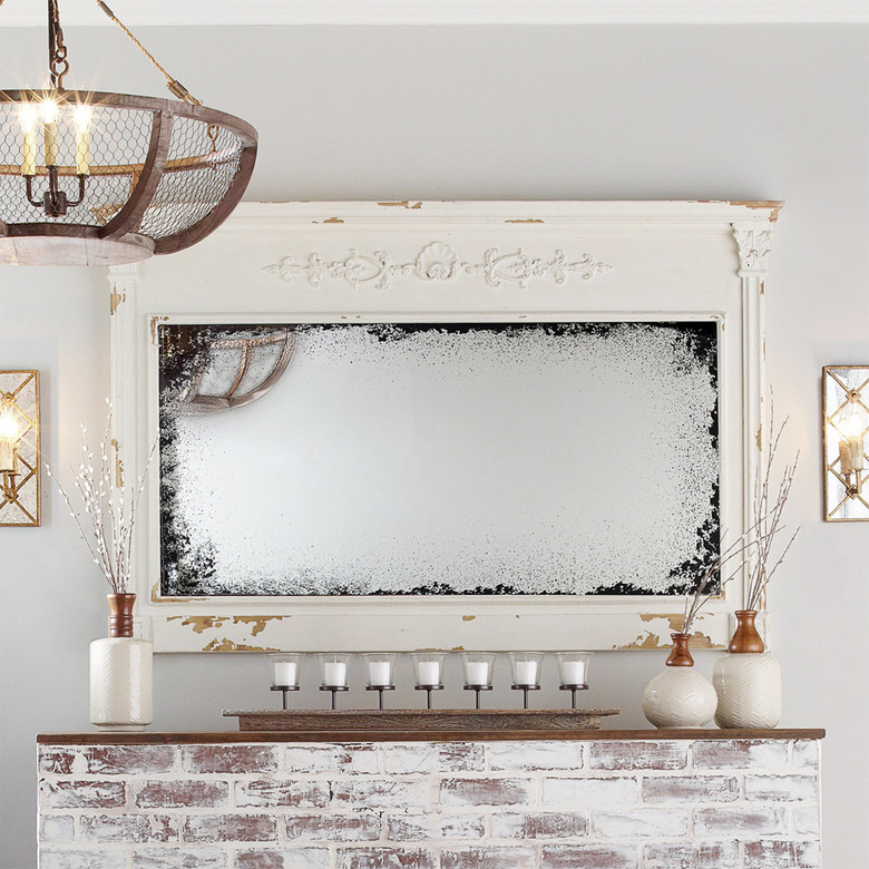 An antique-inspired mantel mirror with a chipped paint finish, like the Vintage Market Mantel Mirror at Shades of Light, provides a rustic focal point for a farmhouse-style living room.