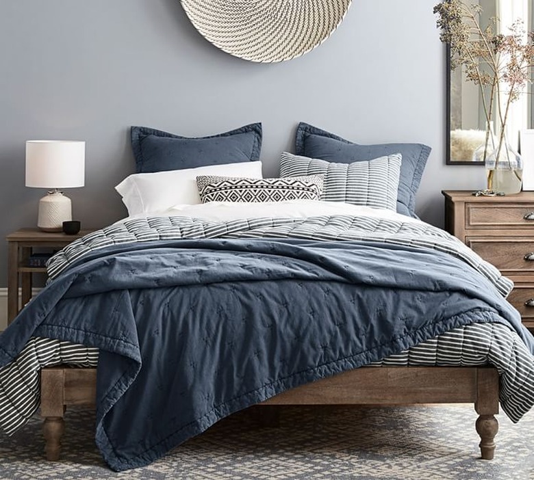 A low profile wooden platform bed with turned legs, like the Astoria Platform Bed at Pottery Barn, brings a rustic touch to any bedroom.