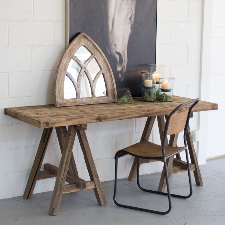 Versatile and sophisticated, a saw-horse style console table composed of recycled wood, like the Hilaire Console Table at Wayfair, moonlights as a mini farmhouse-inspired workstation in a bedroom.