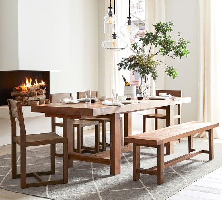 Consider a dining table made of thick cuts of solid wood, like the Reed Extending Dining Table at Pottery Barn, to keep things simple in a rustic dining room.