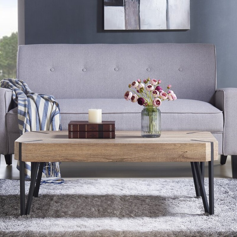Anchor a farmhouse-inspired living room with a rustic unfinished wood coffee table on metal legs, like the Vincente Coffee Table at Joss & Main.