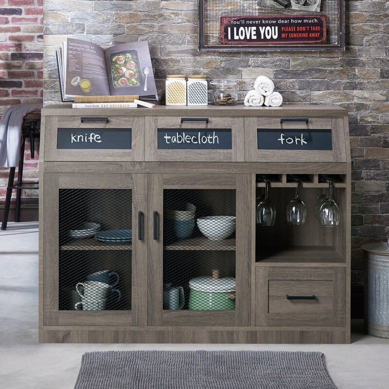 A contemporary farmhouse-style server with metal mesh panels and chalkboard faces, like the Bairoil Server at Wayfair, will help keep your serving ware handy and organized in a dining room.