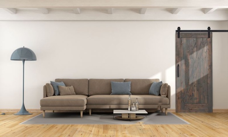 Use a modern sliding barn door, like the Z Barn Door at Rustica, to define a farmhouse-style living room in an open layout space.
