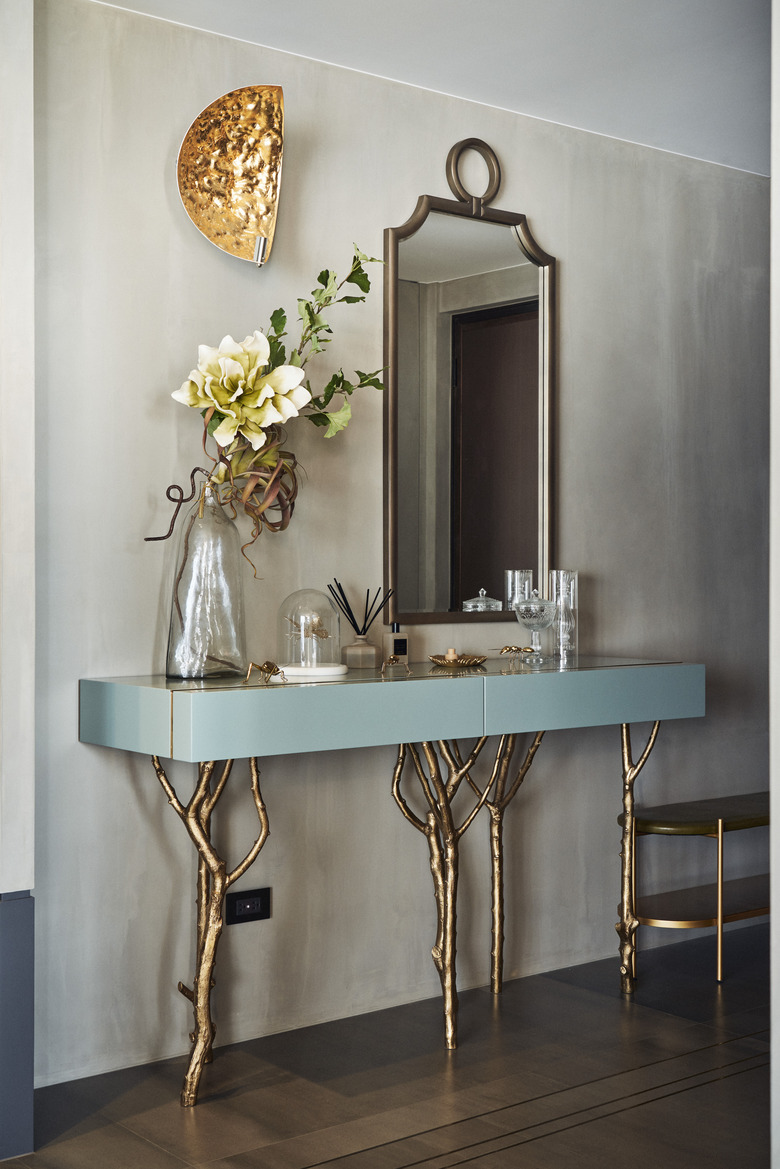 A crescent moon-shaped copper metallic lamp from the Italian lighting company Catellani & Smith is a glowing welcome to the entryway. A Ginger & Jagger Fig Tree console table, with branch-like legs and a blue lacquer top, is an unexpected piece.