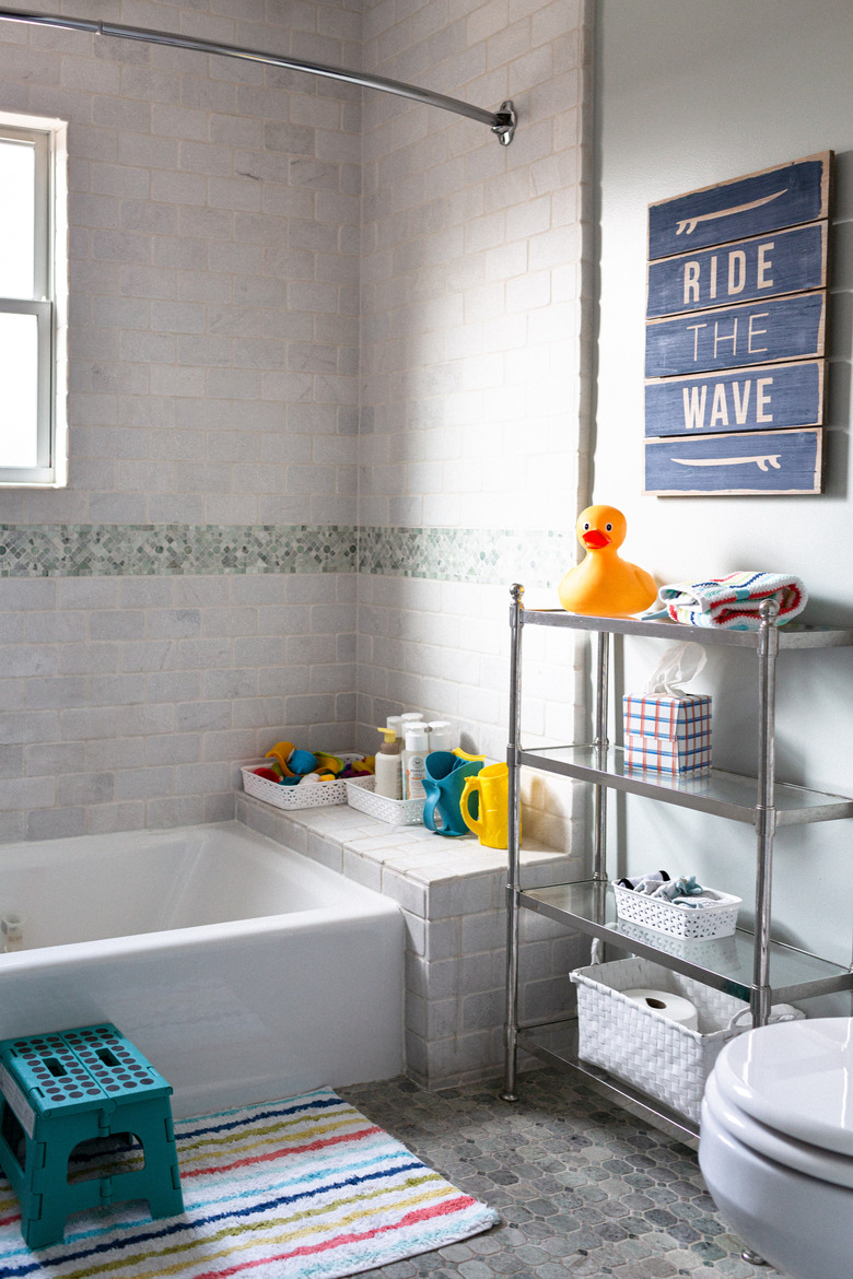 Last but not least, you'll design a practical, yet oh-so-fun, kids' bathroom. It should undoubtedly be playful, with details like punchy, patterned wallpaper and brightly-colored cabinetry, but it needs to work for kids and their little bodies, too. From storage to kid-ready sinks (we prefer a trough sink for a kiddo's bath), the bathroom should reflect your child's height and needs.