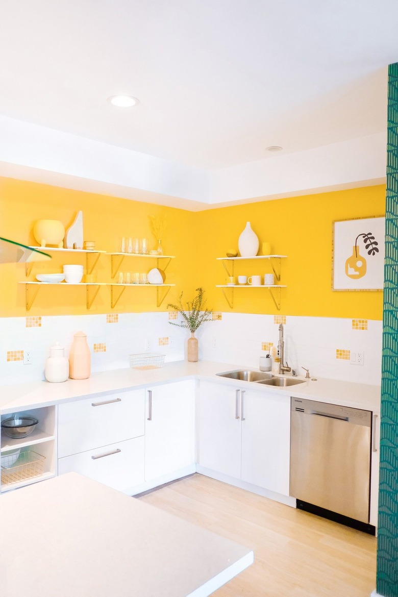 Not all yellow kitchens are bright and cheerful. This moody space photographed by Derek Swalwell shows us how to balance the vibrant color by pairing it with a healthy dose of black. Open shelving, wood features, and clean lines help keep the space from feeling too dark and heavy.