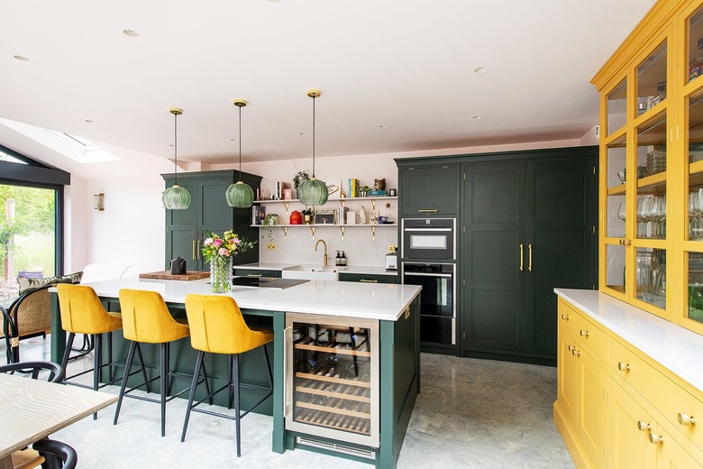 If you really want to warm up your yellow kitchen, wood countertops are definitely the way to go, as proven by this dream culinary space from Reath Design. The dark wood finish of the counters helps balance the vibrant yellow walls and cabinets, while also adding a rustic note. But the fun doesn't stop there — the matching dark wood flooring, open shelving, and cabinet hardware tie the whole country-inspired scene together.
