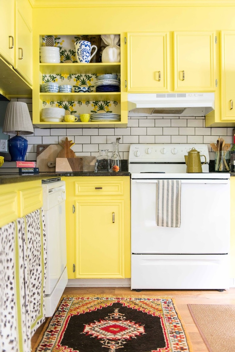 Adding yellow cabinets will really energize your cook space. Here, Elizabeth of College Housewife transforms a rental kitchen using a two-tone cabinet color idea to ensure that the yellow shade doesn't overpower the entire design.