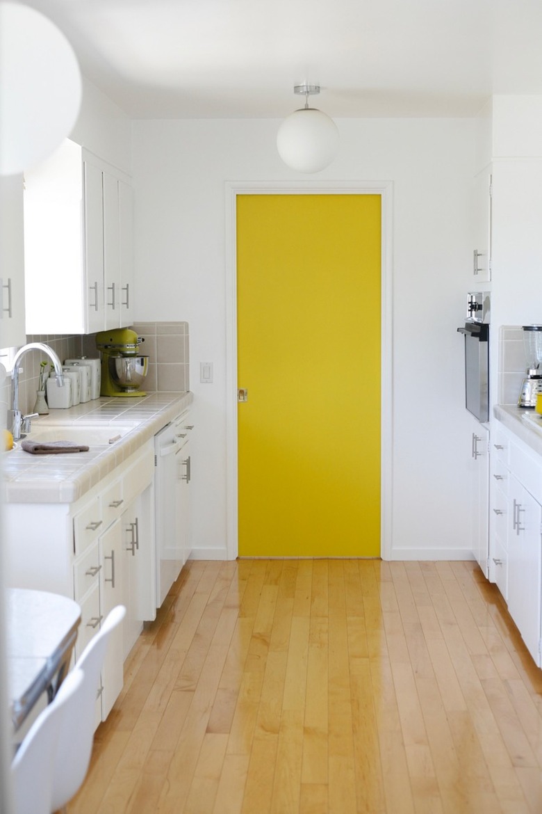 Turn your plain pantry door into an official design moment with a coat of lemon yellow paint à la Suburban Pop. The white cabinets and pale gray countertops in this minimalist kitchen act as the perfect backdrop for the vibrant star of the show.
