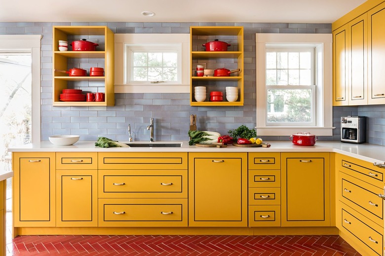 Every element of this kitchen is a bold choice, from the red herringbone floor tile and matching dishware to the yellow kitchen cabinets with black detailing. Even the backsplash tile is flaunting a cool shade of blue. Somehow it all works in this culinary space photographed by Dan Cutrona. It just goes to show you that when it comes to design, rules were made to be broken.