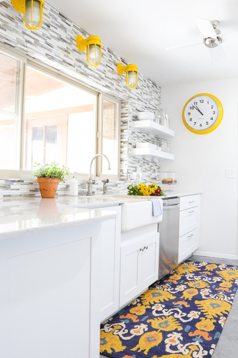 Liven up a neutral gray and white kitchen by switching out your basic light fixtures for yellow options instead. This culinary design by Bettijo from Paging Super Mom shows us that while adding playful wall sconces can really change up the whole look of your space, throwing in a matching yellow clock and coordinating rug will really kick things up a notch.