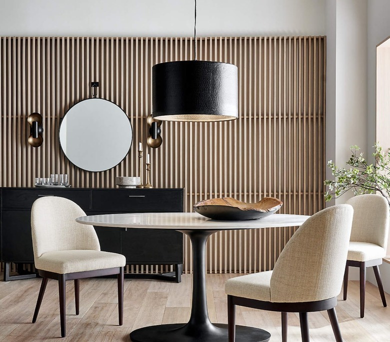 And speaking of statement-making ceiling light for the dining room, this pendant light clad in rectangular crystals from Pottery Barn will make even the starkest of spaces feel rich and elegant. It's the perfect solution to when you want the effect of a beaded or crystal chandelier, but still like the sleek look of a drum pendant.