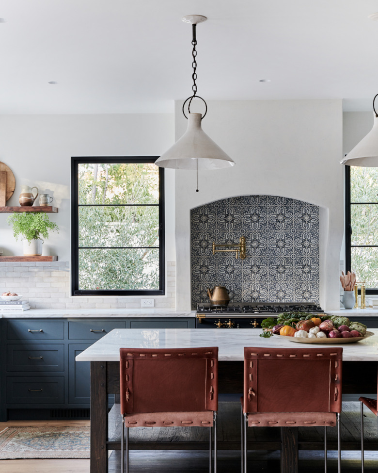 A Mexican-inspired tile backsplash doesn't need to cover the expanse of the wall if you're concerned that too much color and patterning will overwhelm your kitchen. Instead, you can bring in just a touch of it above your cooktop, a look that designer Amber Lewis nailed in this open kitchen.