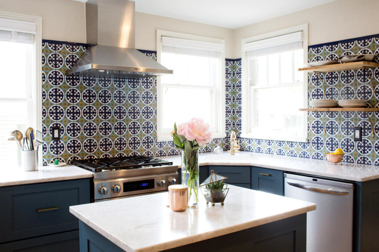 Even if you have a kitchen that you'd consider to be traditional, a Mexican-inspired tile backsplash can still work — and work well. Amid classic details like a marble countertop and navy blue cabinets, this culinary space spotlighted by Fireclay Tile looks complete and visually interesting thanks to a green and blue patterned tile.