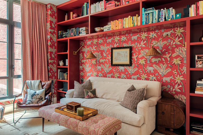 New developments tend to celebrate minimalism, with neutral palettes and sleek surfaces. But for their their new duplex in the East Village, a couple wanted to bring a bit of British tradition. The husband was raised in England, so interior designer (and fellow Brit) Louisa Roeder used his background as inspiration for the design. "Right off the bat, my clients knew they wanted a botanical chinoiserie wallpaper in the bedroom and a traditional red den," says Roeder. "With those items set, we each selected landmark items that we loved and built each room around those pieces."