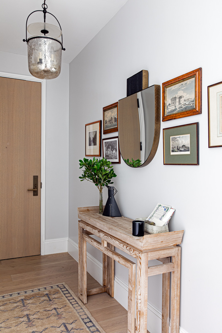 The entry displays prints that are family heirlooms, helping the apartment feel personal from the moment you step inside. Roeder chose a mercury glass lantern by Circa Lighting to hang above the antique rug.
