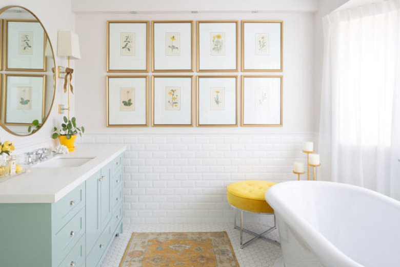 This elegant bathroom cabinet idea by Maria Killam is a study in how to bring the outdoors in. The light blueish-green paint on the vanity pairs beautifully with framed botanicals and yellow decor, resulting in a refreshing space that feels like a warm spring day.