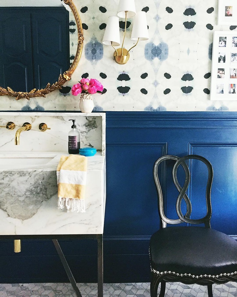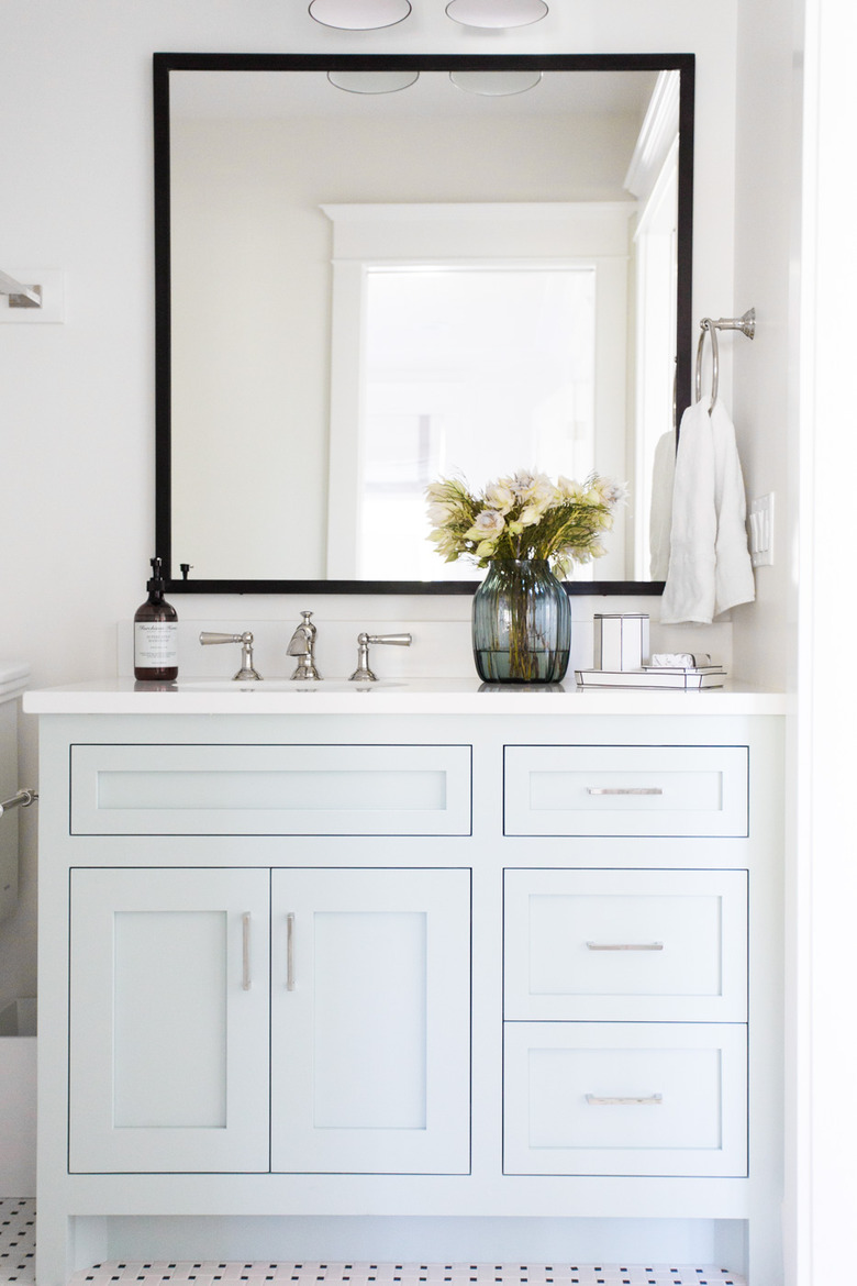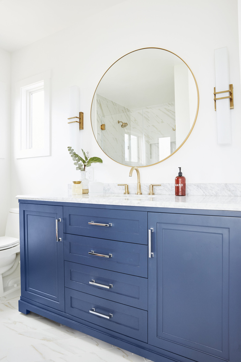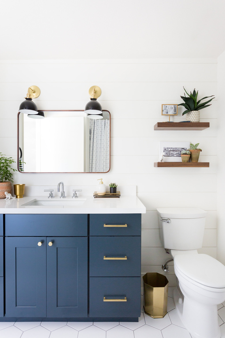 A pop of blue can add a sophisticated touch to a plain white bathroom, no extra effort required. For a quick update to your cabinetry, add a fresh coat of paint, change up the hardware, and keep the rest of the room neutral. Complete the look with a streamlined mirror and wall sconces from Schoolhouse Electric for an industrial touch à la Lindsey Brooke Design.
