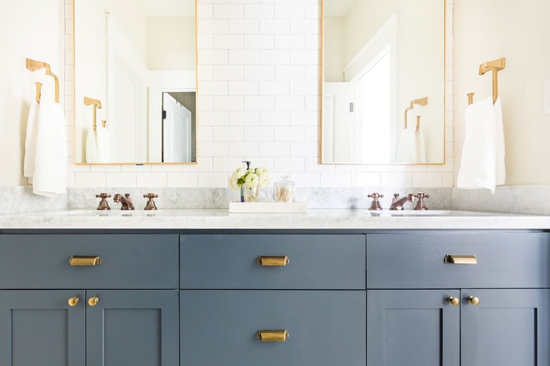 The combination of blue and brass instantly adds a hint of luxury to any space. And it looks like the team over at Oyster Creek Studios got the memo loud and clear, selecting sleek brushed-brass hardware for this blue bathroom cabinet, and then taking it a step further, with brass mirrors and towel holders for a cohesive design.