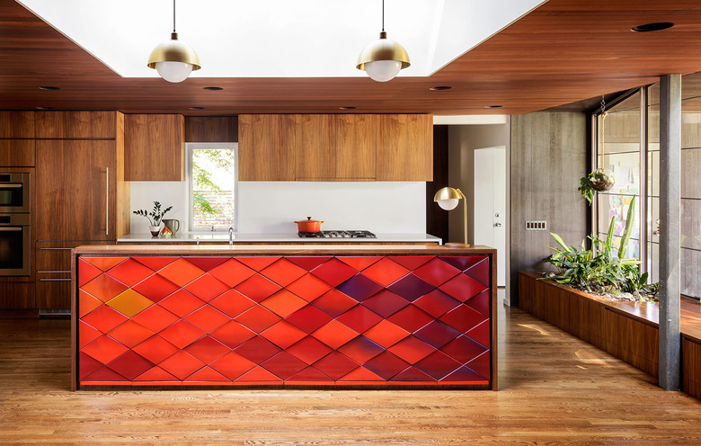 Make your midcentury kitchen island the focal point, and a piece of art in its own right, by covering it with eye-catching tile. When she remodeled a William Fletcher house in Portland, Jessica Helgerson stayed true to the home's midcentury roots while thoughtfully updating it. Various shades of bright red tile not only add a pop of color, but texture and movement as well to punctuate the all-wood backdrop.