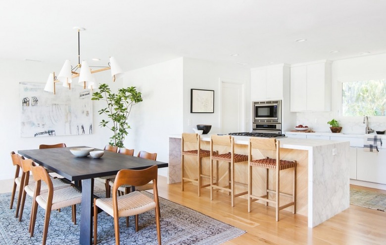 Are your kitchen island dreams constrained by space? Don't fear: An oversize peninsula is a practical alternative that offers three sides of workspace and achieves similar functionality without requiring as much square footage. It also effectively separates the kitchen from an adjacent room, like the dining room as seen in this chic cook space by Amber Lewis. Timeless materials including marble countertops, vintage chairs, and white cabinets complete the look.