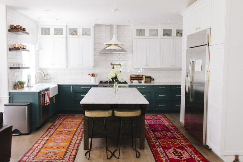 Here's your chance to roll out those rugs in the kitchen: Traditional area rugs and runners in dark and earthy tones go particularly well with a dark-wood island as proven by Amber Lewis with this luxe design. (Dark beams overhead pair nicely, too.)