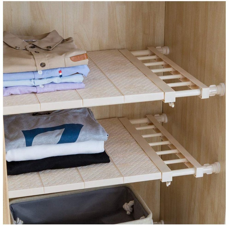Dreaming of more shelf space for your closet? We have the solution for you. Composed of sturdy clapboard and steel, this adjustable shelf uses tension rods to mount inside your closet, so you can instantly create more closet storage opportunity without leaving any damage behind.